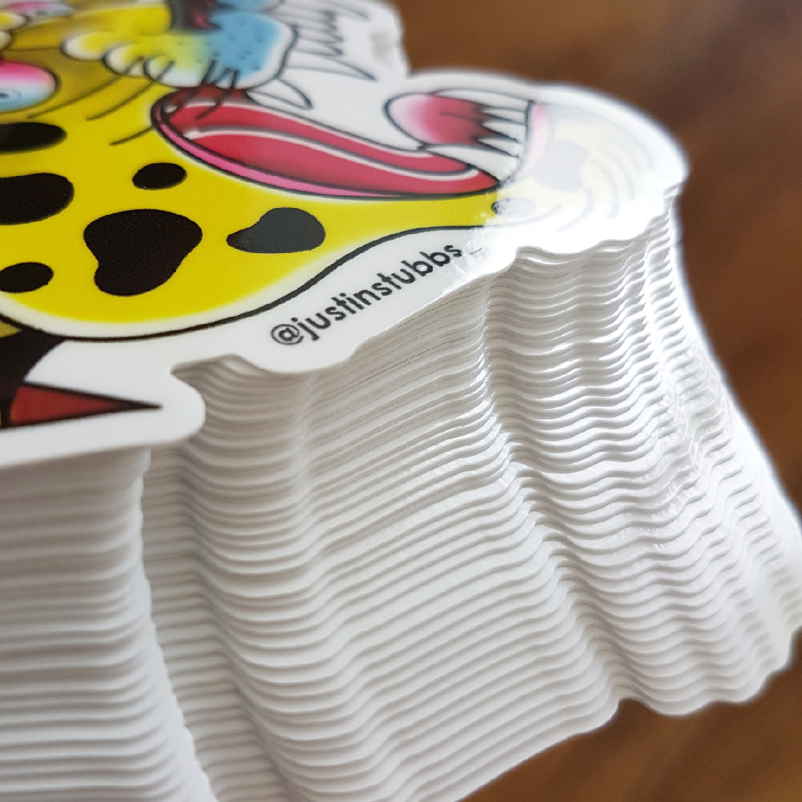They’re trimmed to follow the exact shape of your design, giving your artwork extra impact and a polished, professional finish. From laptops and drink bottles to street signs and pub toilets, they stand out in any setting. Made from tough, waterproof vinyl, they’re built to handle whatever life throws at them.